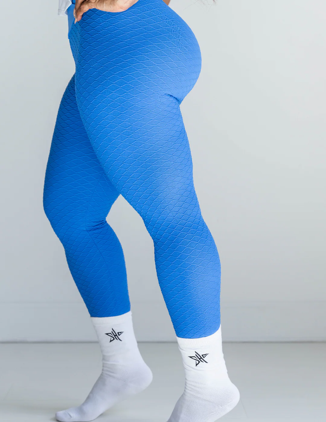 Rouched stretch high-waisted leggings designed to lift and smooth. Textured pattern offers a slimming look to your curves.